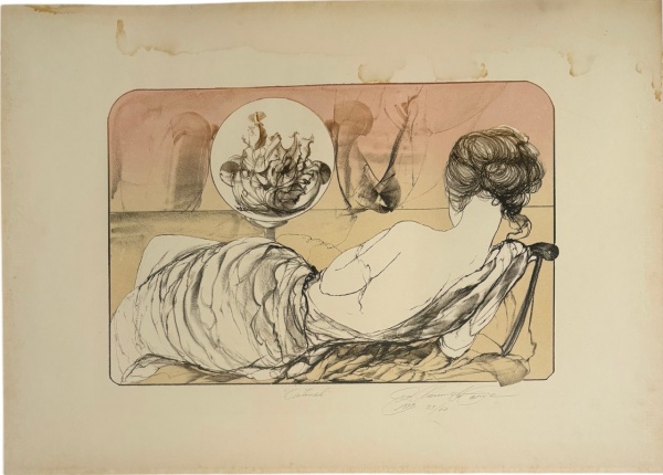 • Gravura em papel, assinada e datada 1973, edição numerada 33/60.  Intitulada OutonalComposição figurativa de mulher reclinada, traço delicado e atmosfera poética, em paleta suave de tons sépia e terrosos. Apresenta sinais naturais do tempo. Mede 50 x 70 cm.