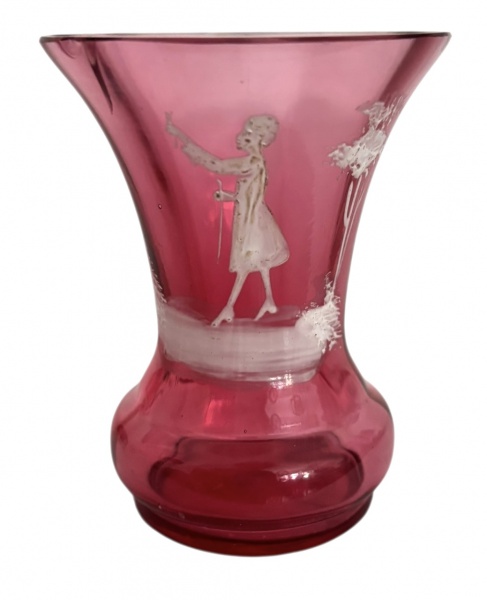• MARY GREGORY - Vaso em vidro artístico na tonalidade rubi, com decoração em camafeu representando figura feminina em branco opaco, aplicada manualmente. Corpo bojudo com boca em corneta, característico da produção inglesa do final do século XIX e início do século XX. Peça atribuída à escola de Mary Gregory, reconhecida por cenas figurativas delicadas sobre vidro colorido. Possui discreto bicado. Mede 8 cm.