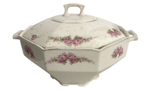 • INGLATERRA - Sopeira em porcelana inglesa, formato oitavado, decoração floral em tons rosados, com tampa original e pegadores laterais. Marca francesa na base. Peça clássica para mesa posta ou coleção.Estado de conservação: bom, com craquelê e sinais naturais do tempo. Possui fio de cabelo. Mede 30 cm.
