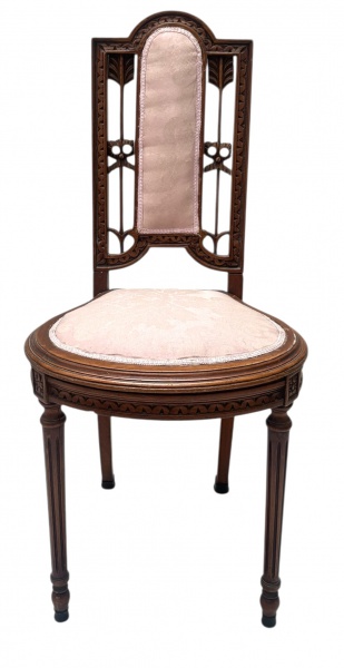 • LUIS XVI - Antiga cadeira em madeira entalhada, com encosto vazado de linhas elegantes e detalhes decorativos geométricos ao estilo francês LUIS XVI. Assento e espaldar estofados em tecido claro, conferindo leveza e sofisticação ao conjunto. Pernas afiladas e acabamento refinado, típica peça de inspiração europeia, ideal para salas, escritórios ou ambientes clássicos. Uma das pernas necessita reforço. Mede 90 cm altura.