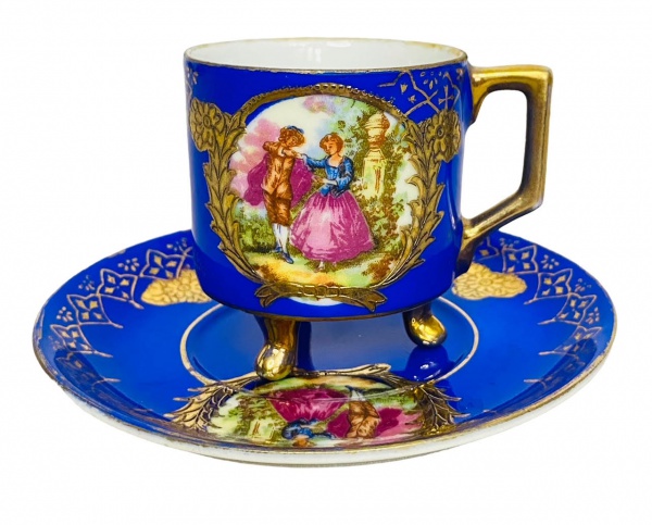 • WINDSOR - Rara xícara para cafe e ou coleção em porcelana europeia adornada com cena galante pintada à mão, com policromia e vibrante ouro sobre fundo azul. Possui três pezinhos. Acompanha seu respectivo pires.