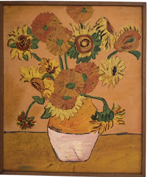 • ANDREA BRANDANI - Óleo sobre tela representando natureza-morta com flores em vaso, composição vibrante em tons ocres, amarelos e verdes. Pincelada expressiva e textura marcante, assinatura visível na parte frontal. Homenagem a Van Gogh. Obra emoldurada, com sinais do tempo compatíveis com a idade, mantendo forte impacto decorativo e artístico. Proteção de moldura baguete. Mede 62 x 52 cm.