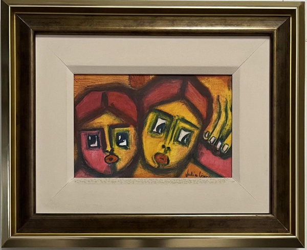 • JULIO CESAR ALVAREZ - (Paraguai 1949.....) Oleo sobre tela representando figuras, assinada no canto inferior direito, protegida por moldura de madeira dourada e paspatur. Medida da obra 25 x 17cm. Medida total 36 x 44cm. Acervo Mauro Balsalobra Leiva.
