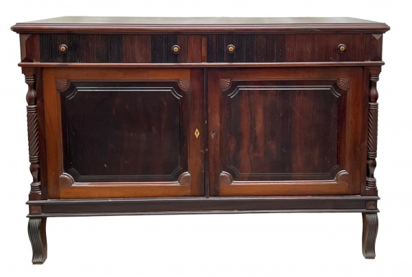 • D. MARIA - Imponente móvel de encostar, dito aparador, em jacarandá maciço composto de duas portas frontais que acondicionam compartimento interno, duas gavetas superiores com seus respectivos puxadores, entradas e entalhes em marfim, sustentado por colunas torneadas ao estilo e período D. Maria, império brasileiro. Mede 98cm altura x 1,45cm comprimento x 55cm largura.