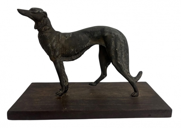 • EUROPA SÉC. XIX - Magnifica escultura representando figura canina da raça galgo, em petit bronze patinado, representando o animal em posição elegante e alongada. Base retangular em madeira. Peça de estética clássica, ideal para composição de ambientes e colecionismo.Estado de conservação compatível com a idade. Necessita reforçar fixação na base parte frontal. Medida da base 40 x 21 cm. Medida da escultura 36 x 25 cm.