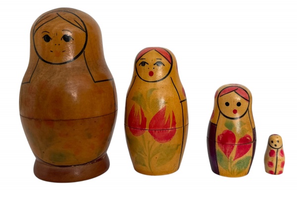 • Conjunto de bonecas russas matrioskas em madeira, com pintura tradicional floral e acabamento envelhecido. Peças simpáticas e colecionáveis, mostrando marcas do tempo que realçam o charme artesanal. Ideal para decoração ou coleção vintage. Medida da maior 9cm de altura.