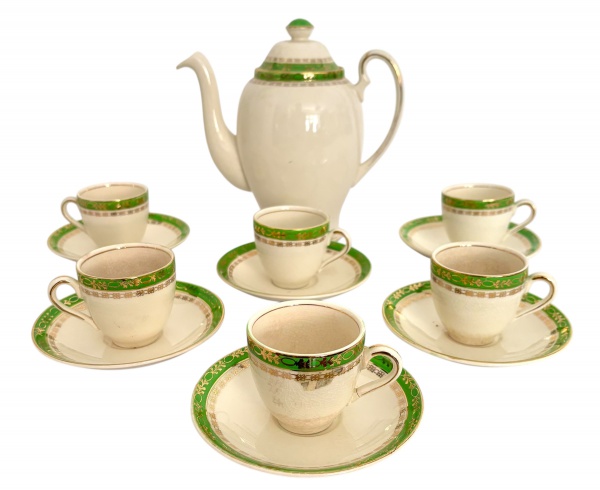 • INGLATERRA - Gracioso serviço de café inglês Alfred Meakin, início do século XX. Conjunto em faiança com esmalte craquelado, decoração em verde vivo e detalhes dourados florais, composto por bule, seis xícaras e seis pires. Peças com marcas originais ao verso e elegante acabamento clássico. Ideal para colecionadores de porcelanas inglesas antigas. Medida do maior 21 cm.