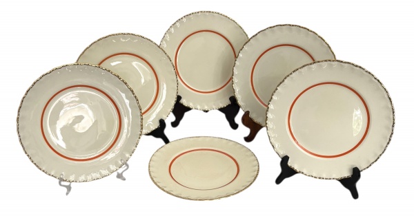 • INGLATERRA - Conjunto inglês de 6 pratos rasos em faiança inglesa manufatura Grindley, linha Cream Petal, com borda ondulada com detalhe dourado e aro em vermelho coral. Peças antigas com craquelê natural do tempo, ideal para coleção ou composição de mesa clássica. Mede 23 cm diâmetro.