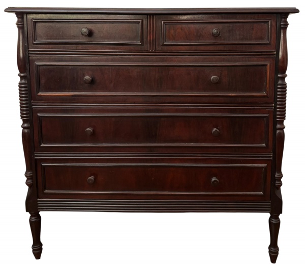 • DONA MARIA - Cômoda em jacarandá, estilo Dona Maria, contendo cinco gavetas frontais sendo três grandes inferiores e duas menores superiores, protegidas por colunas torneadas ao estilo império. Mede 95cm altura x 50cm largura x 1m comprimento.