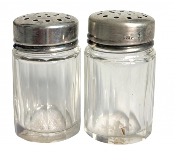 • PRATA DE LEI - Par de delicados saleiros em cristal translucido e tampas em prata de lei. Periodo 1900. Mede 4cm.