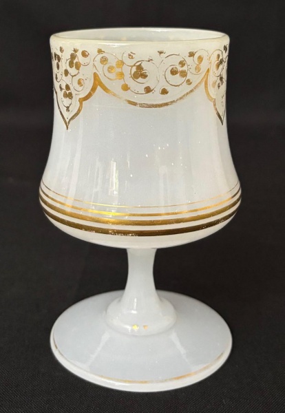 • BACCARAT - Taça em opalina francesa Baccarat branco leitoso, adornada a mão com arabescos e contorno em vibrante ouro. Meados séc. XIX. Mede 12cm.