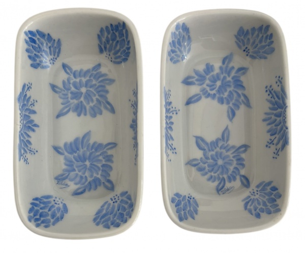 • Par de pequenas travessas em porcelana, tipo petisqueiras em clássica porcelana branca decorada com pintura à mão de flores azuis. Possui assinatura. Medida 16cm comprimento x 9cm largura x 4cm altura.