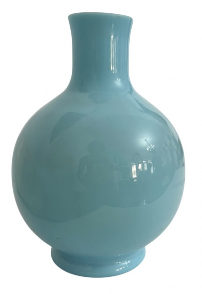 • Vaso em opalina francesa azul, formato bojudo. Meados 1900. Mede 25cm altura.
