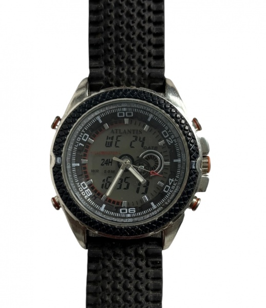 • Relógio Masculino Atlantis  Analógico/DigitalRelógio de pulso Atlantis modelo 68729, com caixa em aço inoxidável e pulseira preta em borracha texturizada. Mostrador com dupla leitura  analógica e digital  oferecendo funções de hora, calendário, cronômetro e alarme.Bisel com acabamento esportivo e botões laterais em tom metálico com detalhes em cobre, conferindo um estilo robusto e moderno.Marca: AtlantisModelo: 68729Movimento: Quartzo com display analógico e digitalRecursos: Iluminação (Illuminator), calendário completo, cronômetro, alarme, hora 24hResistência à água: 50 m (Water Resistant 50M)Material da caixa: Aço inoxidávelMedida do visor 4,5cm.Peça prática e versátil, ideal para uso diário ou coleção de relógios esportivos.