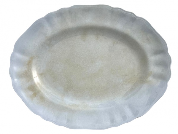 • Travessa em Porcelana Inglesa  J&G Meakin Celeste. Antiga travessa oval em porcelana inglesa, marca J&G Meakin  modelo Celeste, com delicado contorno ondulado e pátina natural do tempo que realça seu charme vintage. Apresenta craquelado característico da idade, sem trincas estruturais. Dimensões aproximadas: 30 cm x 23 cm. Peça ideal para colecionadores e amantes de porcelanas inglesas clássicas.