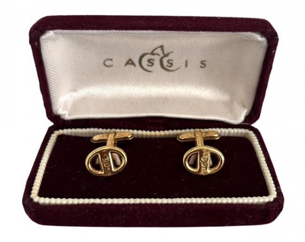 • CASSIS - Par de abotoaduras em metal dourado, acondicionadas em embalagem original. Mede 9 x 5cm.