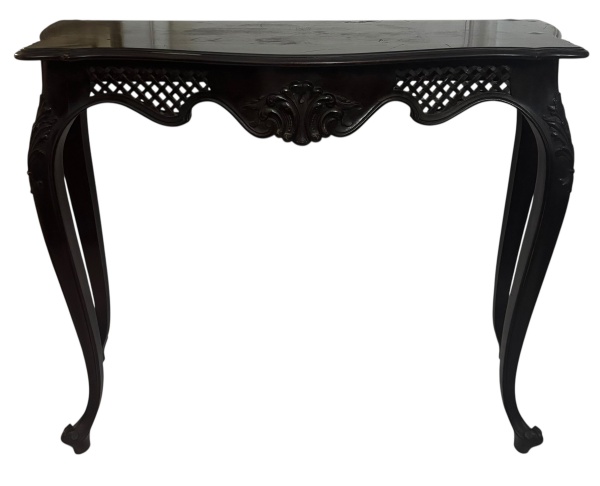 • Aparador em jacaranda, estilo francês Luis XV com saia vazada em entalhes com florão central. Período 1900. Mede 1,13cm x 88cm x 43cm.