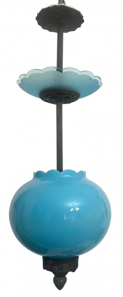 • Antiga luminária de teto para uma lâmpada, em opalina francesa azul e metal dourado. Mede 68 x 26cm.