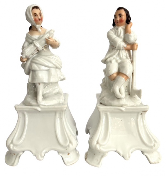 • EUROPA SEC XIX  - Par de esculturas em porcelana europeia policromada possivelmente alemã representando nobres com vestes sobre bases. Uma possui perda no verso. Meados séc. XIX. Ambas assinadas e numeradas. Mede 22cm.