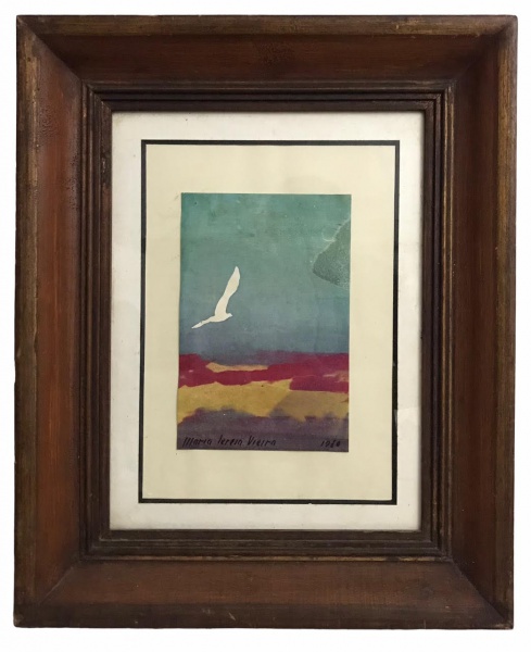 • MARIA LORENA VIEIRA - Graciosa aquarela sobre cartão representando paisagem com pássaro. Assinada no canto inferior e datada. Protegida por moldura de madeira nobre entalada e resquícios de vibrante ouro e vidro transparente. Medida da obra 15cm x 22cm.