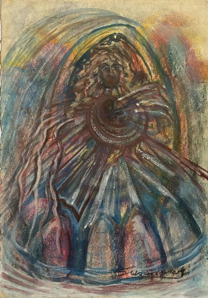 • SUZANA LEVY (Rio 1937 / idem 2023) - Obra em pastel sobre cartão, "figura religiosa", assinada no canto inferior direito e verso, datada 2002. Mede 35 x 50cm.