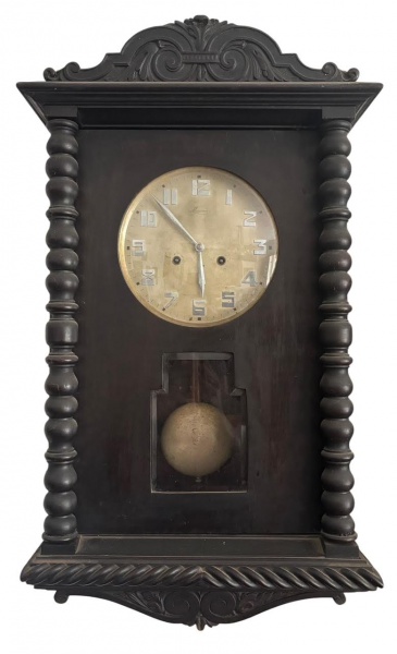 • PORTUGAL - Antigo relógio de parede, funcionamento a corda, dois furos, 'MASSON", acondicionado em caixa de madeira com colunas em espiral e florão ao alto. Funcionamento desconhecido. Acompanha chave e pêndulo. Mede 70 x 40cm.