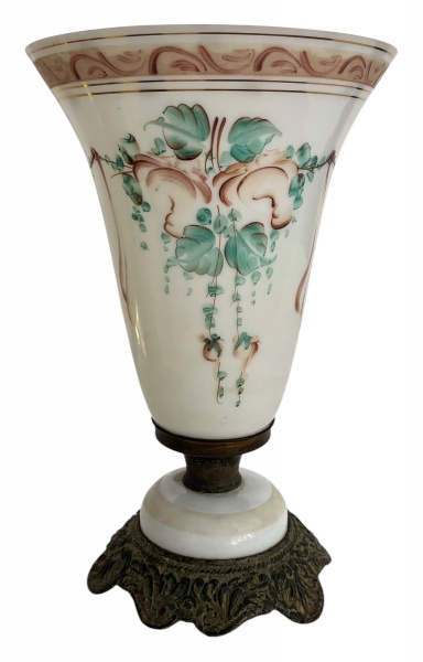 • Magnifico vaso em opalina francesa branco leitoso fartamente adornada com ramalhetes de flores pintados à mão, amarrações em metal. Mede 32cm altura x 21,5cm diâmetro.