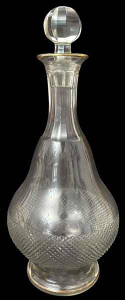 • Antiga garrafa para uísque em demicristal canelado, borda e base com resquícios de douração, tampa no formato bola. Mede 33cm.