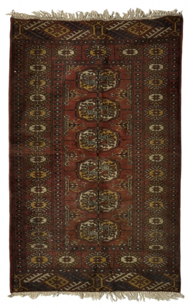 • Elegante tapete oriental  Bokhara de manufatura artesanal, com campo vermelho profundo decorado por sequência de medalhões geométricos (gül) em tons de marfim, azul e ocre. Bordaduras ricamente ornamentadas com motivos florais estilizados e extremidades com franjas originais. Peça clássica, de forte apelo decorativo, ideal para compor salas, escritórios ou ambientes sofisticados. Mede 1,28 cm x 78 cm.