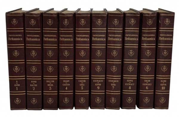 • Enciclopédia Britannica  Coleção Clássica (c. 1960)Conjunto de 10 volumes da Encyclopaedia Britannica, edição inglesa, encadernação original em couro marrom com gravações douradas. Obra de referência universal, ricamente ilustrada, com pranchas coloridas e em preto e branco, abrangendo artes, ciências, história e cultura geral. Exemplar de época, ideal para colecionadores, bibliotecas e decoração clássica. Bom estado geral, com sinais naturais do tempo. Mede 28 x 22 cm.