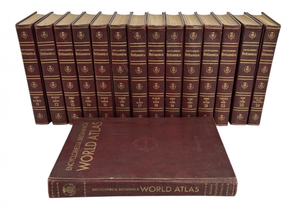 • Enciclopédia Britânica  World Atlas (edição original, séc. XX)Parte de conjunto de14  volumes da Encyclopaedia Britannica, com atlas mundial encadernado em couro, mapas políticos e físicos coloridos, índices e glossários. Publicação impressa nos EUA, com direitos autorais entre 1942 e 1960. Obra de referência clássica, de grande valor histórico, cartográfico e decorativo. Estado de conservação compatível com a época. Medida do maior 38 x 28,5 cm.