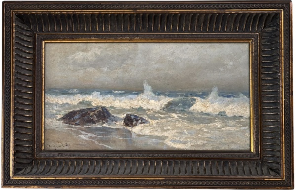 • Virgílio Lopes Rodrigues (1863-1944) Obra em óleo sobre madeira, representando marinha com rochedos e ondas, de composição equilibrada e pincelada solta, típica da pintura de paisagem do período. Obra de Virgílio Lopes Rodrigues, assinada no canto inferior esquerdo. Verso com etiqueta antiga de identificação e indicação de medidas 27 x 38 cm. Intitulada Rebenta. Acompanha moldura antiga entalhada e dourada, compatível com a época. Medida total 50 x 33 cm.