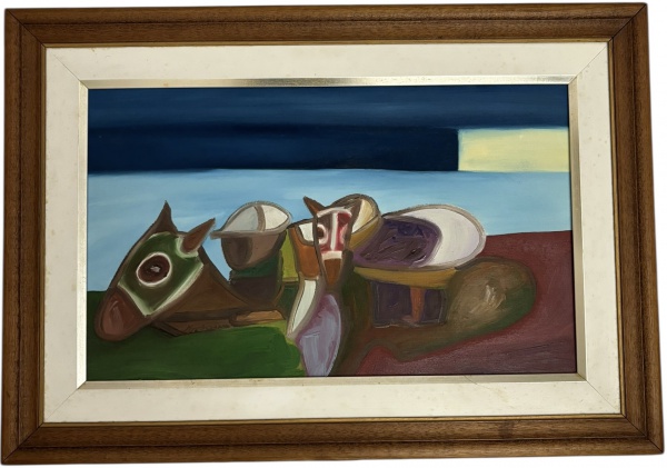 • Obra em acrílica sobre tela, datado de 1982, apresentando composição figurativa de linguagem moderna, com formas simplificadas, volumes marcados e uso expressivo da cor. A obra revela diálogo com tendências pós-modernas e neofigurativas do período, combinando construção geométrica e atmosfera onírica. Assinada no verso e no canto inferior esquerdo. Medida da obra 54 x 33 cm. Medida total 71 x 50 cm.