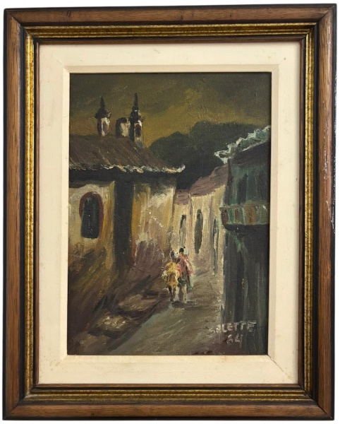 • SALETTE - Obra em óleo sobre tela "igreja ao fundo", assinada e datada 64 no canto inferior direito, protecao de moldura de madeira patinada e paspatur. Medida da obra 34 x 25cm. Medida total 46 x 37,5cm.