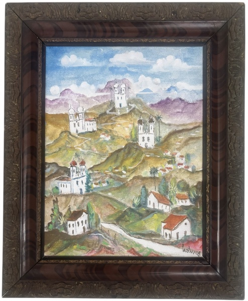 • HOLMES NEVES (1925 / 2008). Paisagem com igrejas, interior Minas Gerais, óleo sobre tela, assinado e datado 2006. Composição ingênua e poética, típica do artista, com vilarejo colonial em meio a colinas. Proteção de moldura de madeira da época. Medida da obra: 40cm x 30cm. Medida total: 52cm x 42cm.