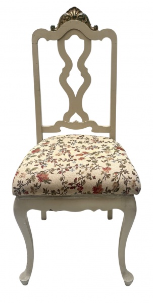 • Cadeira de estilo clássico europeu, em madeira patinada em tom claro, com encosto vazado de linhas curvas e elemento decorativo superior dourado. Assento estofado em tecido floral, conferindo charme e delicadeza à peça. Pernas curvas, de inspiração francesa, ideal para compor salas, quartos ou ambientes românticos e elegantes. Mede 1,10 cm altura.