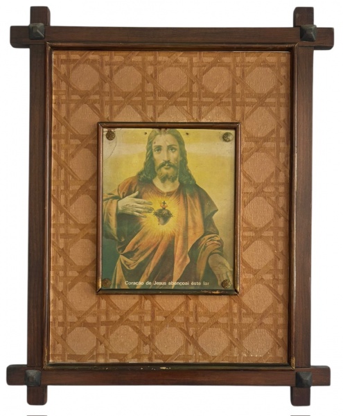 • Imagem Religiosa  reprint Sagrado Coração de JesusEstampa colorida sobre papel, protegida por vidro. Apresentada em moldura de madeira com paspatur decorativo, conjunto de caráter devocional, com sinais naturais do tempo. No estado. Verso com suporte para fixação em parede. Mede 44 x 54 cm.
