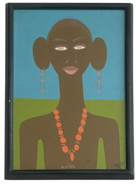 • ALOISIO - Quadro Decorativo  Figura Feminina. Técnica mista sobre papel, assinada Aldísio.Composição estilizada de figura feminina, paleta vibrante em tons de azul, verde e laranja. Apresentado em moldura de madeira com vidro. Verso com sistema de fixação e sinais naturais do tempo. Medida total 37 x 51 cm.