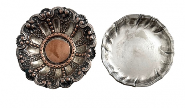• Salva/porta alianças em prata, formato circular, com borda trabalhada em relevo rococó e três pés. Superfície lisa central, verso com marca de contraste e sinais naturais do tempo. Peça decorativa ou de uso cerimonial, tradição europeia, final do século XIX / início do XX. Peso 30,8 g. Mede7 cm diâmetro.