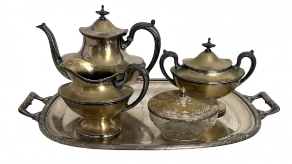 • Conjunto para chá e café em metal prateado Zepter & Barton, composto por bule, açucareiro com tampa, leiteira, manteigueira em cristal lapidado com tampa metálica e bandeja oval com alças, peças de linhas elegantes e estilo clássico, início do século XX. Mede 48 x 31 cm.