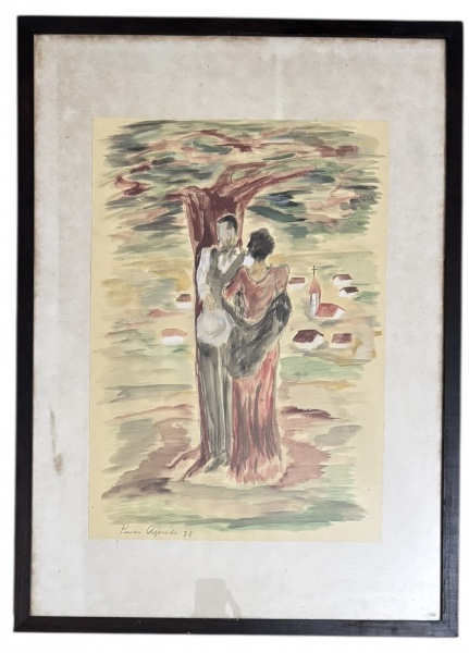 • PINA BASTOS - Aquarela sobre papel, assinada e datada PINA AZEVEDO 78, época que a artista assinava com o nome de casada. A composição apresenta pinceladas soltas e harmonia de tons terrosos e verdes, transmitindo atmosfera romântica e serena. Moldura simples com passe-partout. Proteção de vidro transparente e moldura de madeira estilo baguete. Medida da obra 36 x 50 cm. Medida total 53 x 73 cm.