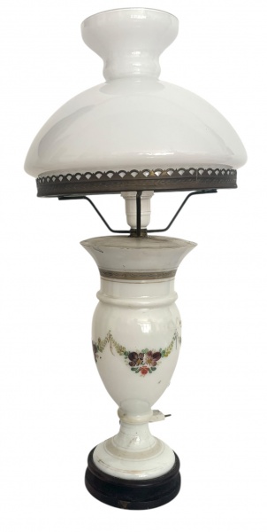 • Abajur vintage em opalina francesa branco leitoso com delicadas guirlandas florais pintadas mão, base em madeira e cúpula em vidro leitoso no estilo lampião. Peça charmosa, com estética romântica e toque clássico, ideal para ambientes elegantes e aconchegantes. Possui fiação, funcionamento desconhecido. Mede 55 cm altura. Manchas do tempo. Meados 1900.