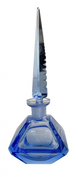• Perfumeiro  em cristal Moser, de refinado design geométrico, com base quadrada em tom azul translúcido e tampa alongada em formato de obelisco facetado. Exemplo da excelência da tradicional manufatura tcheca, conhecida pela pureza e brilho de seus cristais lapidados.Uma peça de destaque para colecionadores e amantes do vidro artístico europeu. Mede 25 cm altura.