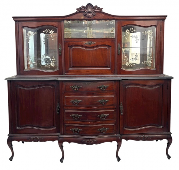 • FELIPE SOARES & CAMPOS - Palaciano louceiro em madeira nobre acastanhada, estilo Luís XV, com belíssimo trabalho de marcenaria e ferragens originais. Parte superior com portas de cristal lapidado e florais gravados, prateleiras internas espelhadas e vitrine central. Base com gavetas curvas, puxadores em metal trabalhado e laterais com portas emolduradas. Peça fabricada pela marcenaria Nossa Senhora da Penha  Felipe Soares & Campos Ltda., Rio de Janeiro, conforme etiquetas originais no verso. Um exemplar de elegância e tradição do mobiliário brasileiro do inicio do século XX. Divide-se em duas partes, a superior é móvel. Mede 1,96 cm comprimento x 60 cm largura x 1,86 cm altura.
