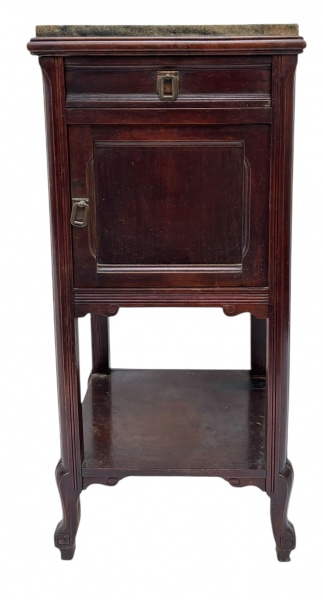• LEANDRO MARTINS - Mesa de cabeceira antiga da tradicional Fábrica de Móveis Leandro Martins, produzida em madeira nobre acastanhada, com tampo de mármore rajado, gaveta superior e compartimento interno com porta. Modelo clássico, de linhas elegantes e acabamento refinado, representando a qualidade da marcenaria brasileira do início do século XX. Periodo transitório ART NOUVEAU para ART DECO. Possui selo no interior da gaveta. Ideal para ambientes que valorizam mobiliário histórico e de excelente execução. Mede 85 cm altura x 40 cm largura.
