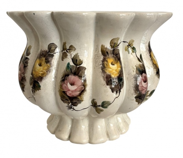 • Charmoso vaso ou cachepot antigo em faiança, formato abaulado e borda recortada, com pintura manual de rosas em tons suaves. Peça com craquelê natural do tempo, assinada na base, revelando autenticidade e caráter artesanal. Objeto decorativo de grande apelo vintage, ideal para compor ambientes clássicos e românticos. Possui assinatura da artista. Mede 23cm de altura x 30cm de diâmetro.