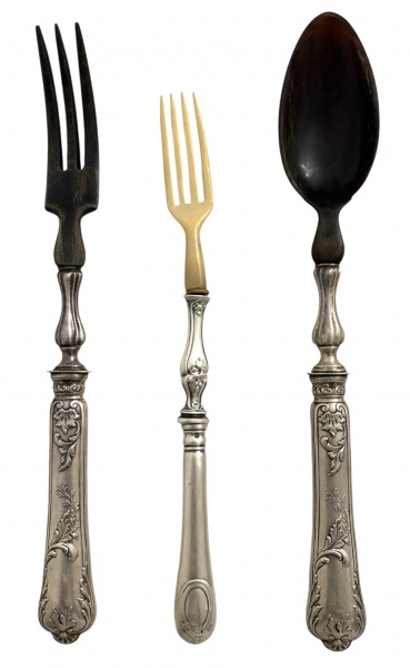 • EUROPA SÉC. XIX - Conjunto de três peças antigas de servir sendo dois garfos e uma colher, cada um com cabo em prata decorado com ramalhetes de flores em alto-relevo e parte de osso animal, estilo clássico europeu meados séc . XIX. Peças ideais para colecionadores de talheres antigos ou decoração vintage. Medida do maior 28 cm.