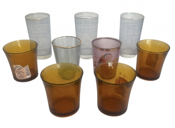 • DURALEX - Lote contendo nove copos antigos variados, incluindo quatro em vidro âmbar DURALEX, copos decorados e modelos com linhas em relevo e dourado. Conjunto misto, ideal para decoração, uso criativo ou composição vintage. Ótima oportunidade para quem aprecia vidros antigos. Meados anos 50. Medida do maior 11 cm.