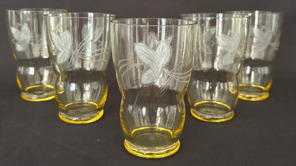 • VENEZA ANOS 50 - Conjunto de copos em cristal veneziano dos anos 50, com delicado tom âmbar e gravação floral fosqueada. Peças de charme retrô, desenho orgânico e leveza típica do vidro artístico italiano. Mede 11,5 cm.