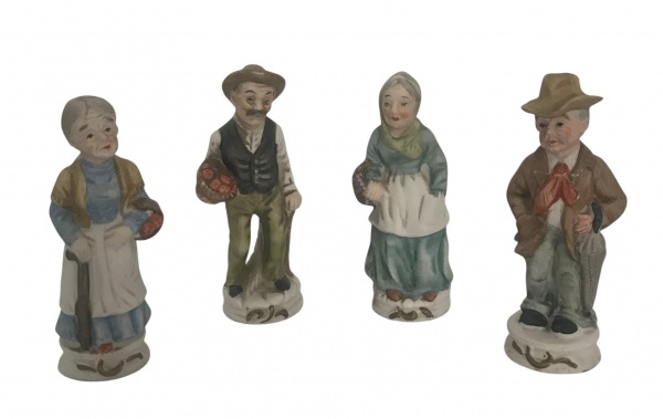 • Conjunto de 4 pequenas esculturas em porcelana pintada à mão, representando camponeses em trajes típicos com cestos de frutas e flores. Base circular simples com marca. Um possui sinal de restauro. Medida do maior 12cm.